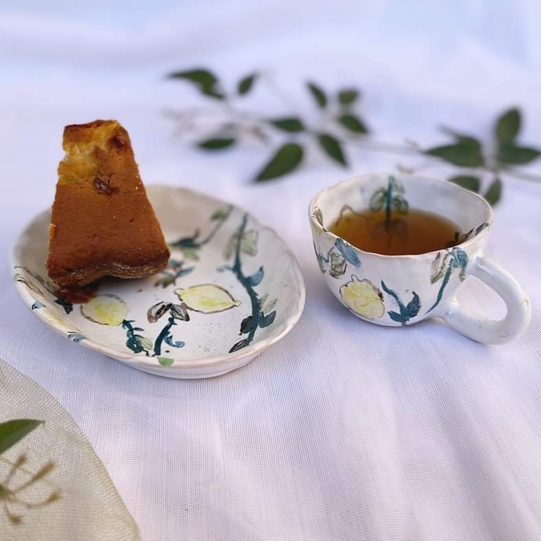 كوب وصحن مشكلة يديوياً مع رسوم الليمون المميزة