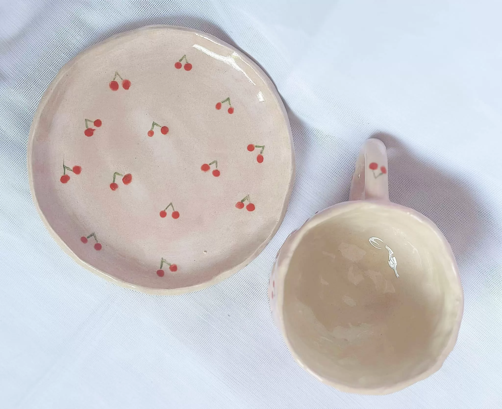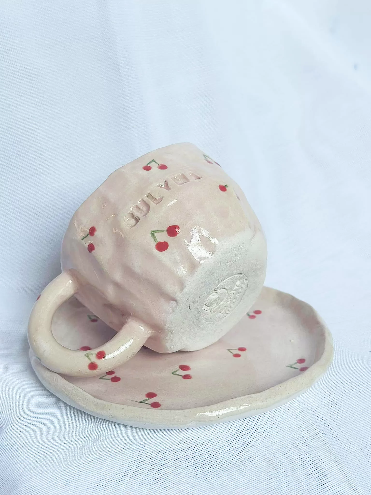 كوب مميز مع صحنه مع رسوم فاكهة الكرز